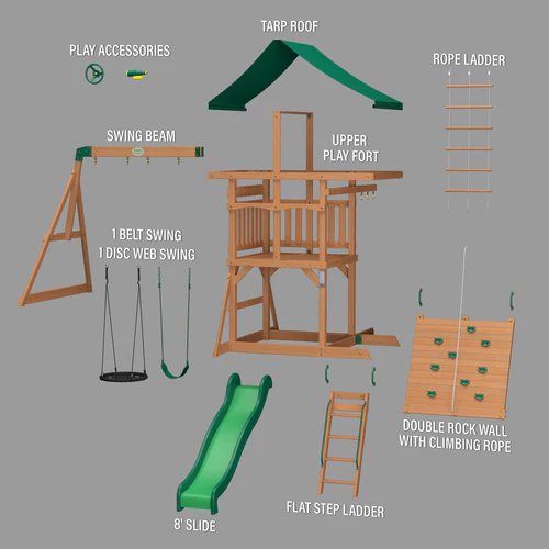 The Grayson Peak Swing Set by Backyard Discovery is the perfect for all your young adventurers, with plenty of space for outdoor play. The extra-wide double rock wall features 9 climbing holds and a rope assist, allowing two kids to climb at the same time for an adventurous route to the upper play deck. Kids can zoom back down on the 8-foot wave slide or catch some air on the super fun web swing and classic belt swings. A tall rope ladder provides another exciting climbing challenge for adventurous climbers. The elevated deck, complete with its canopy roof, toy telescope, steering wheel, and easy-access step ladder, not only offers kids a massive play space with built-in features, but also gives parents peace of mind with excellent visibility. Below, a shaded play area can be transformed into a sandbox where kids can build castles and dig for treasure. It’s ready to assemble for enhanced convenience, allowing you to create an incredible backyard playground for your children with ease. Combining adventure, exercise, and imaginative play, this outdoor swing set is the perfect addition to any outdoor space. Give your kids the backyard of their dreams with the Grayson Peak Wooden Swing Set.