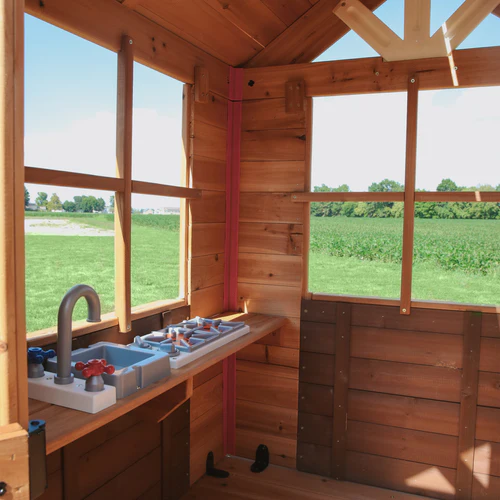 - Attached Playhouse: Elevated playhouse brings imaginations to life with saloon-style doors, a wrap-around balcony, and a play kitchen featuring a toy stovetop and sink