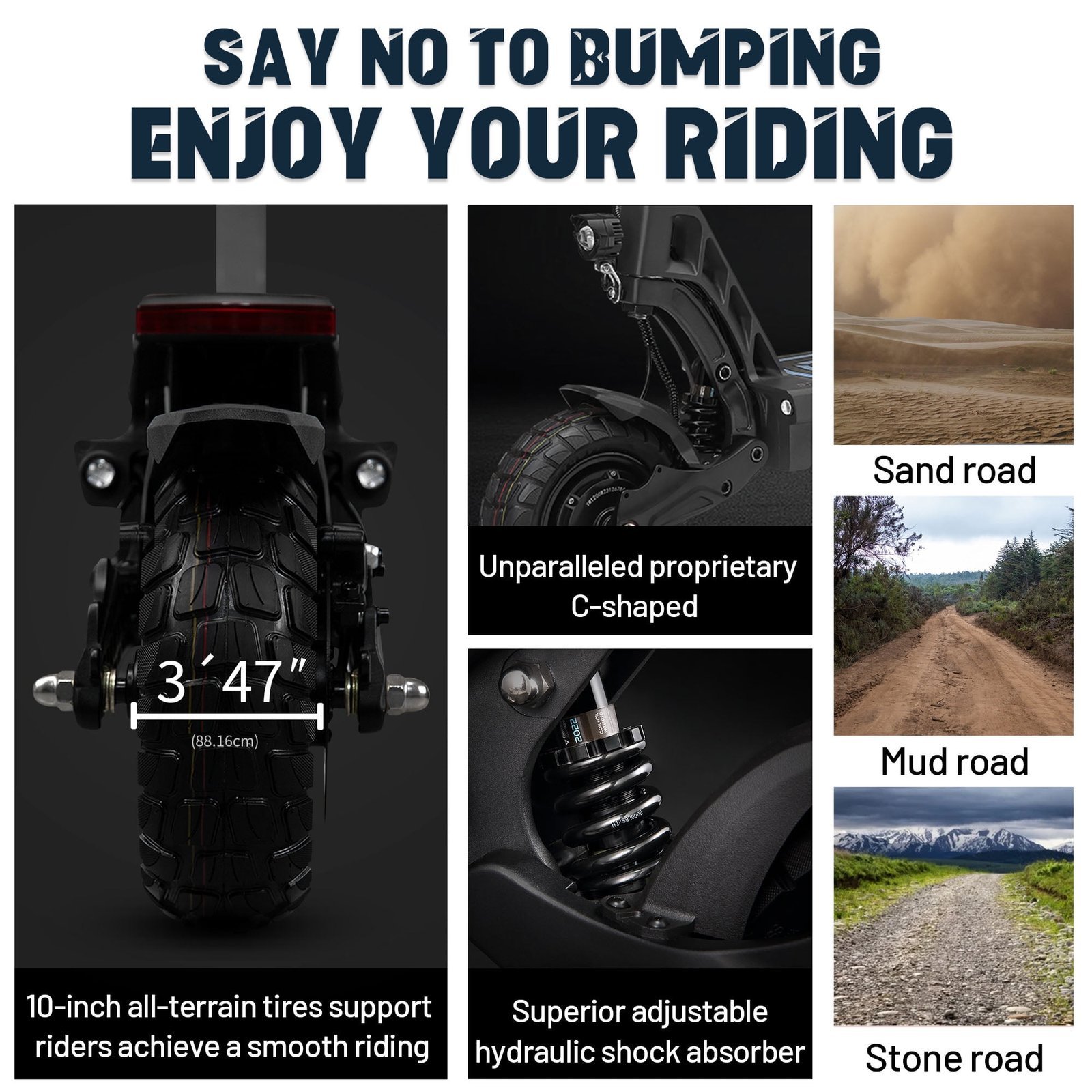 Adjustable Hydraulic Suspension SystemHAWK is equipped with phenomenal adjustable hydraulic shock absorbers which ensures a much smoother ride. Together with the premium hydraulic shock absorber, a proprietary C-shaped front fork design combined with two 10-inch all-terrain tires greatly improve comfort grip and control.