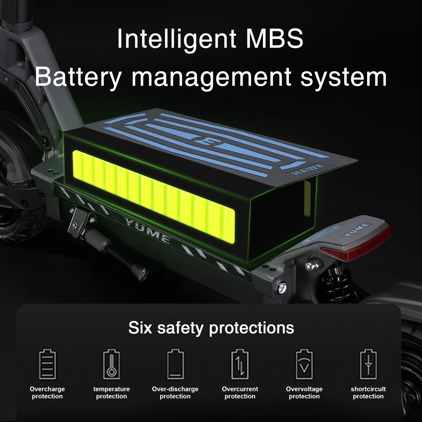 High Capacity and Durable Battery LifeYUME HAWK sports an EV-grade battery using 21700 cells with a total capacity of 60V 22.5Ah and averages 45 miles in range with full charge (terrain dependant). The scooter also supports dual charging.