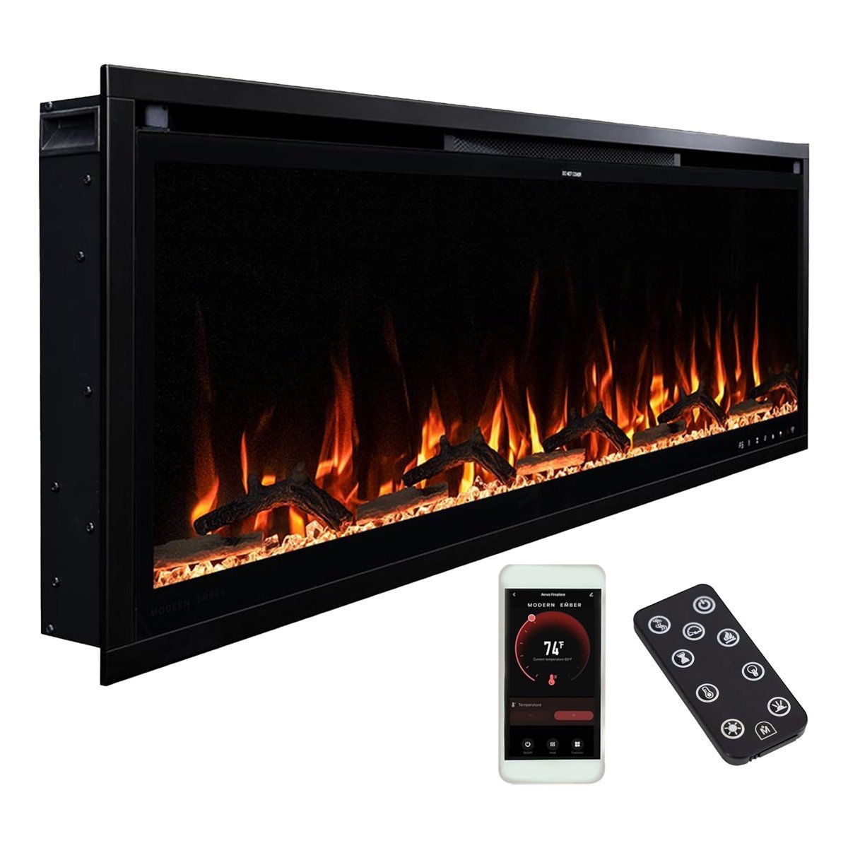 Infuse your home with modern elegance with the Aerus Smart Linear Electric Fireplace, designed for effortless installation in 2×6 walls or wall bump-outs. Whether mounted on the wall or fully recessed, this minimalist fireplace creates a bold focal point, enhancing both modern and transitional interiors. Customize your ambiance with five LED flame colors, three flame speeds, and five brightness levels, paired with ten ember bed colors to suit your mood. Enjoy the flexibility of using the fireplace with or without heat, creating a warm and inviting atmosphere all year round. With WiFi-enabled smart controls, adjust the settings remotely via the mobile app, Alexa, Google Home, or the included remote for ultimate convenience. The 5000 BTU thermostatic heater offers supplemental warmth for up to 400 sq. ft., with precise temperature control from 68°F to 88°F. For added peace of mind, the built-in timer allows for automatic shutoff. Complete with a driftwood log set and clear crystals, this fireplace elevates any space with its sleek, contemporary design. Plus, flexible plug-in or hardwired installation options make setup quick and easy.